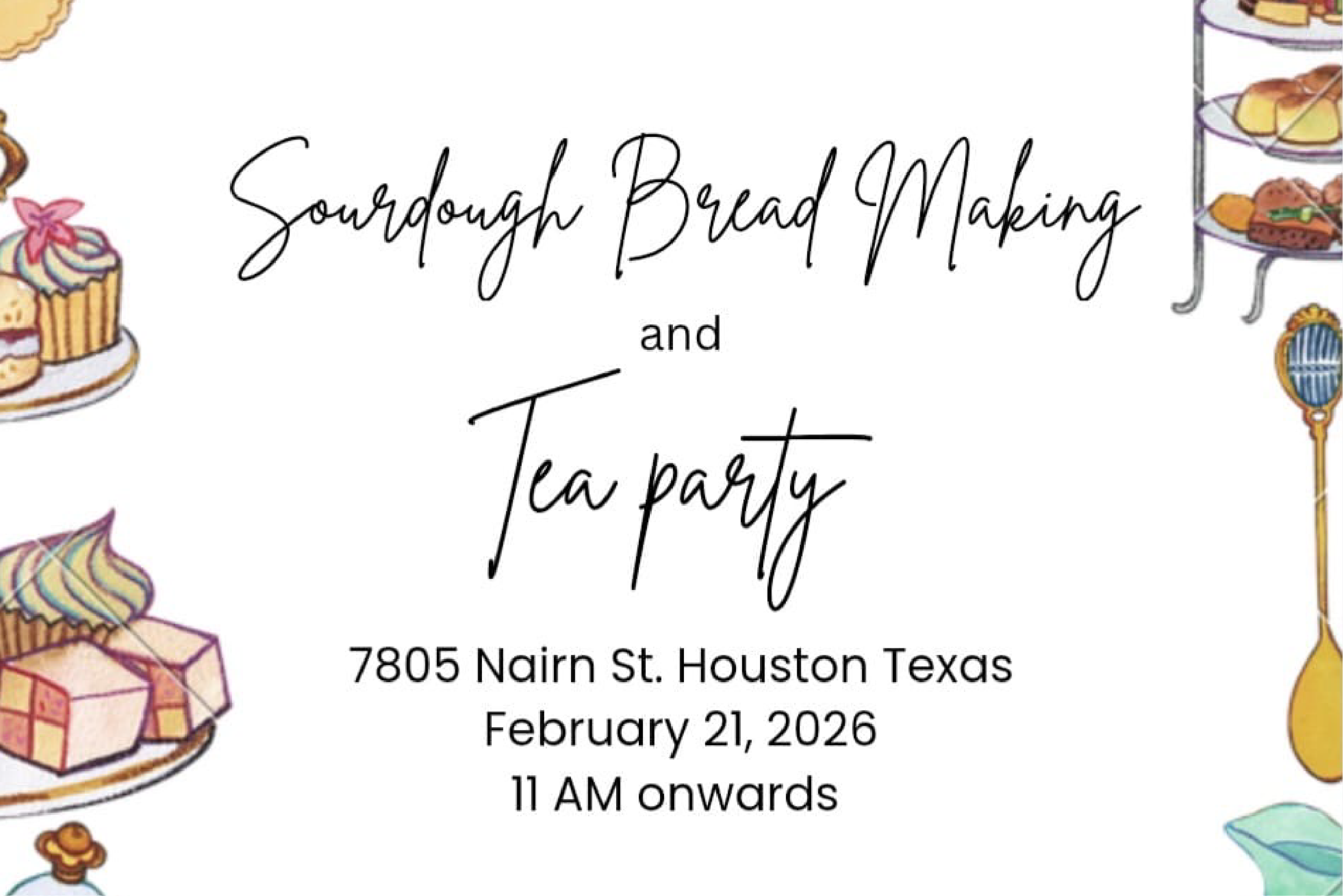 Interested in bread making? Come learn the techniques to make Sourdough bread and enjoy a Tea Party while we wait! Please send an RSVP to Adie Mathews (409-241-8701) on or before February 14.